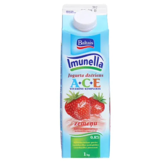 Sastāvdaļas:PIENS, ūdens, zemeņu piedeva 8% (cukurs, zemeņu sula no koncentrāta 35%, krāsviela (biešu sulas koncentrāts), vitamīni 0,9% (A, C, E), aromatizētāji), cukurs, stabilizētājs (pektīns), VĀJPIENA pulveris, ieraugs (tai skaitā bifidobacterium species, lactobacillus acidophilus, lactobacillus paracasei).