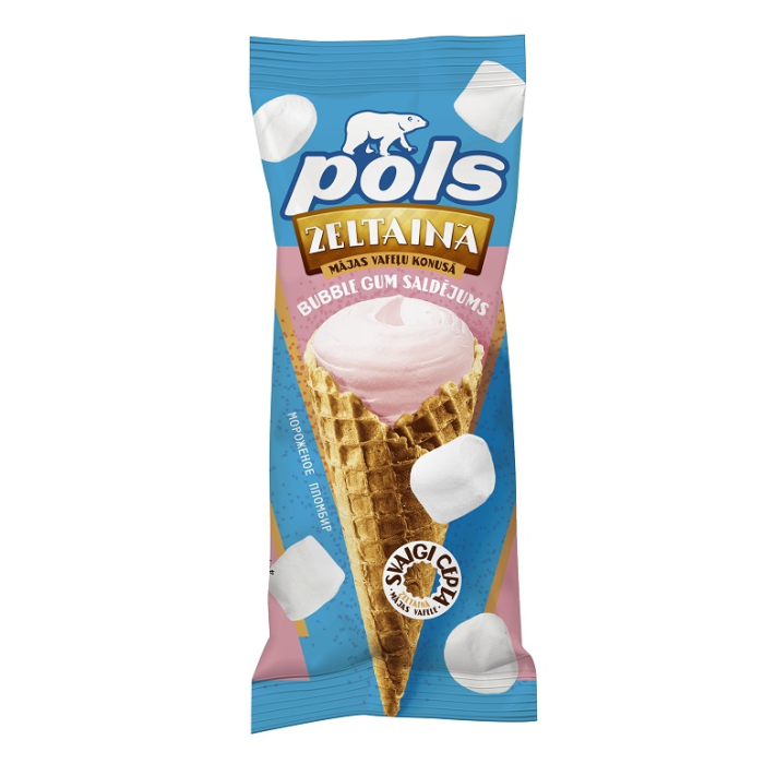 POLS ZELTAINĀ Bubble Gums saldējums mājas vafeļu konusā Latvija 200ml/90g (1/24)