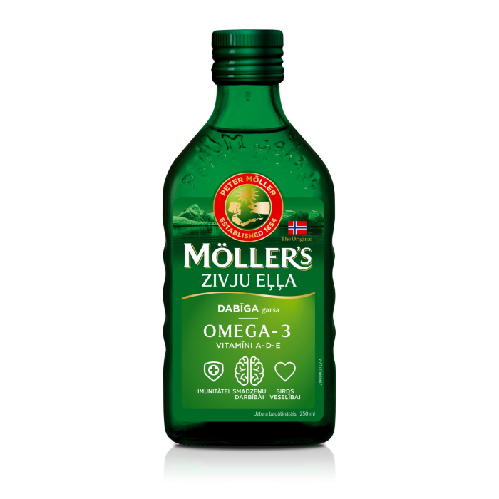 OMEGA-3 VITAMĪNI A-D-E IMUNITĀTEI, SMADZEŅU DARBĪBAI, SIRDS VESELĪBAI. Möller's kopš 1854. gada rūpējas par ģimeņu veselību jau paaudzēm ilgi. Sirds veselībai. Omega-3 taukskābes DHS un EPS veicina normālu sirds darbību. Smadzeņu darbībai. DHS taukskābes palīdz uzturēt normālu smadzeņu darbību un normālu redzi. Imunitātei. D un A vitamīni veicina normālu imūnsistēmas darbību. A vitamīns palīdz uzturēt ādas, gļotādas veselību un normālu redzi. E vitamīns veicina šūnu aizsardzību pret oksidatīvo stresu. Labvēlīgo ietekmi uz veselību panāk, katru dienu uzņemot vismaz: 1250 mg DHS/EPS; 2250 mg DHS.