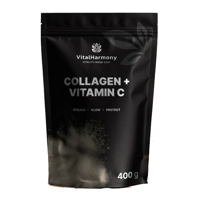 VitalHarmony Collagen + C vitamīns ir augstas kvalitātes uztura bagātinātājs, kas paredzēts ādas, locītavu un imūnsistēmas veselības atbalstam. Satur hidrolizētu liellopu kolagēnu un C vitamīnu, kas veicina kolagēna sintēzi, elastību un vispārējo vitalitāti. Pieejams gardās garšās: zemeņu Un aveņu , mango un bumbieru , un dabīgs (bez pievienotām garšvielām vai krāsvielām) .