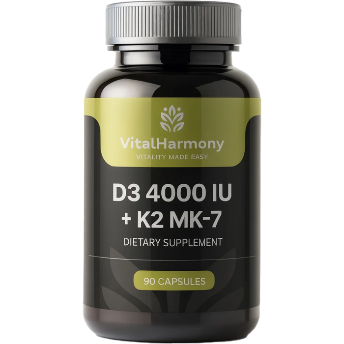 VitalHarmony D3 4000 SV + K2 MK-7 ir spēcīgs ikdienas uztura bagātinātājs, kas paredzēts stipru kaulu, veselīgas sirds un asinsvadu sistēmas un optimālas imūnsistēmas darbības atbalstam. Šī uzlabotā formula apvieno lielu D3 vitamīna devu (4000 SV) ar K2 MK-7 vitamīnu, lai nodrošinātu izcilu biopieejamību un sinerģisku iedarbību.