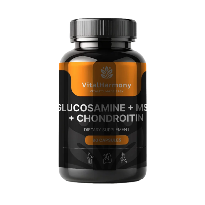 Atbalstiet locītavu veselību un mobilitāti ar VitalHarmony glikozamīna, MSM un hondroitīna formulu. Katrā pudelē ir 90 kapsulas, kas paredzētas, lai veicinātu locītavu veselību, mazinātu iekaisumu un atbalstītu vispārējo mobilitāti.