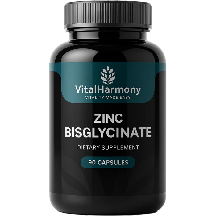 VitalHarmony cinka bisglicināts ir augstas kvalitātes uztura bagātinātājs, kas nodrošina ļoti bioloģiski pieejamu cinka formu. Cinks ir būtisks minerāls, kas atbalsta daudzas ķermeņa funkcijas, tostarp imūnsistēmas veselību, ādas atjaunošanos un šūnu darbību. Cinka bisglicināts ir pazīstams ar savu izcilo uzsūkšanos, padarot to par lielisku izvēli tiem, kas vēlas efektīvi palielināt cinka uzņemšanu.